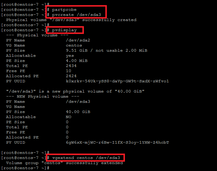 要检查新创建的卷,运行如下的命令可以看出新的物理卷是否已经被创建,是否可用。接下来,我们就可以使用这个新的物理卷来扩展 ‘centos’ 卷组了,如下示: