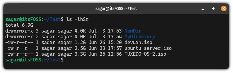 这会使得最近修改的文件在列表的底部显示,当目录中存在大量文件,而你希望查看最近被修改过的文件时,这一命令会特别有用。我在解决我的软件项目问题时就经常用到它。