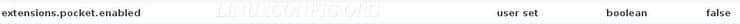 你将会看到一个包含结果的新表格。找一下名为 extensions.pocket.enabled 的设置。当你找到它的时候,双击使其转变为“否”。你也能在这儿编辑 Pocket 的其他相关设置。不过没什么必要。注意不要编辑那些跟 Pocket 扩展不直接相关的任何东西。