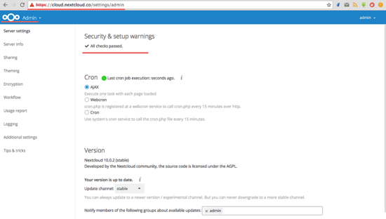 打开你的 Web 浏览器,输入你为 Nextcloud 设置的域名,我这里设置为 cloud.nextcloud.co,然后会重定向到安全性更好的 https 连接。