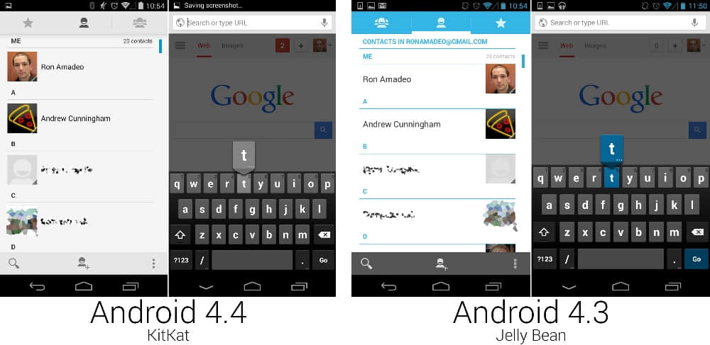 奇巧是电子风格设计的完结。在系统的大多数地方,剩下的蓝色高亮都被换成了灰色。在联系人应用中,头部和联系人列表字母分割线的蓝色都移除掉了。图片的位置换了一侧,底栏变成了浅灰色以和顶部相称。几乎将蓝色渗透进每个应用的键盘,现在是灰底、灰色、灰高亮。这可不是件坏事。应用应该允许有它们自己的配色方案——在键盘上强迫存在潜在的颜色冲突可不是个好设计。
