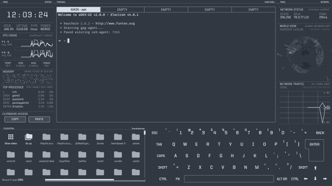 eDEX-UI 允许你使用完全仿真运行五个终端。默认终端类型是 xterm-color,这意味着它支持全色彩。需要注意的一点是,输入时键会亮起,因此如果你在平板电脑上使用 eDEX-UI,键盘可能会在人们看见屏幕的环境中带来安全风险。因此最好在这些设备上使用没有键盘的主题,尽管在打字时看起来确实很酷。