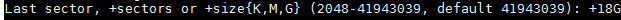 输入最后一个扇区或者分区大小的值。通常推荐输入分区的大小。总是添加前缀 + 以防止值超出范围错误。
