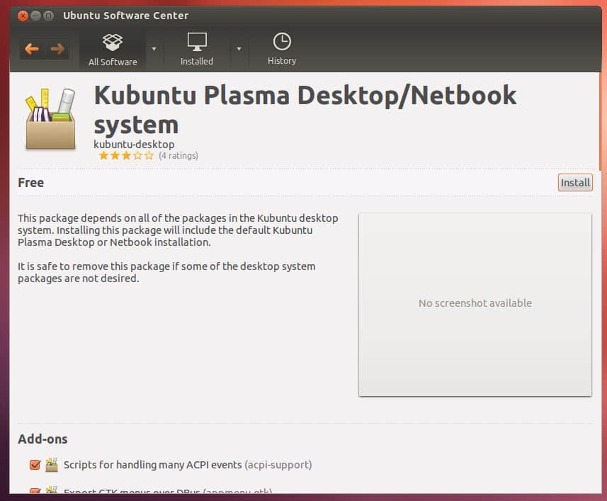 很简单,点击 OK 确认就可以了,然后稍微过一下,你就会看到 Ubuntu Software Center 已经打开执行起来了,我们要做的就是点击那个 Install 按钮了。