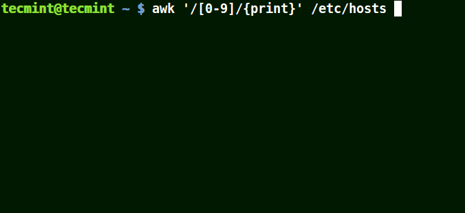 在上面的例子中,文件 /etc/hosts 中的所有行都至少包含一个单独的数字 [0-9]。