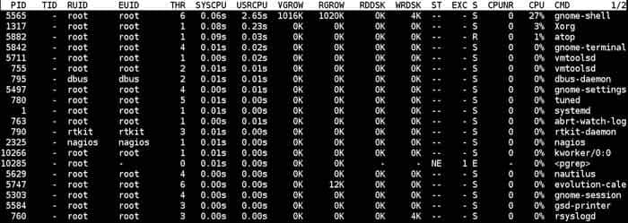 该命令整合了vmstat,iostat和ifstat三种命令。同时增加了新的特性和功能可以让你能及时看到各种的资源使用情况,从而能够使你对比和整合不同的资源使用情况。通过不同颜色和区块布局的界面帮助你能够更加清晰容易的获取信息。它也支持将信息数据导出到cvs格式文件中,从而用其他应用程序打开,或者导入到数据库中。你可以用该命令来监控cpu,内存和网络状态随着时间的变化。